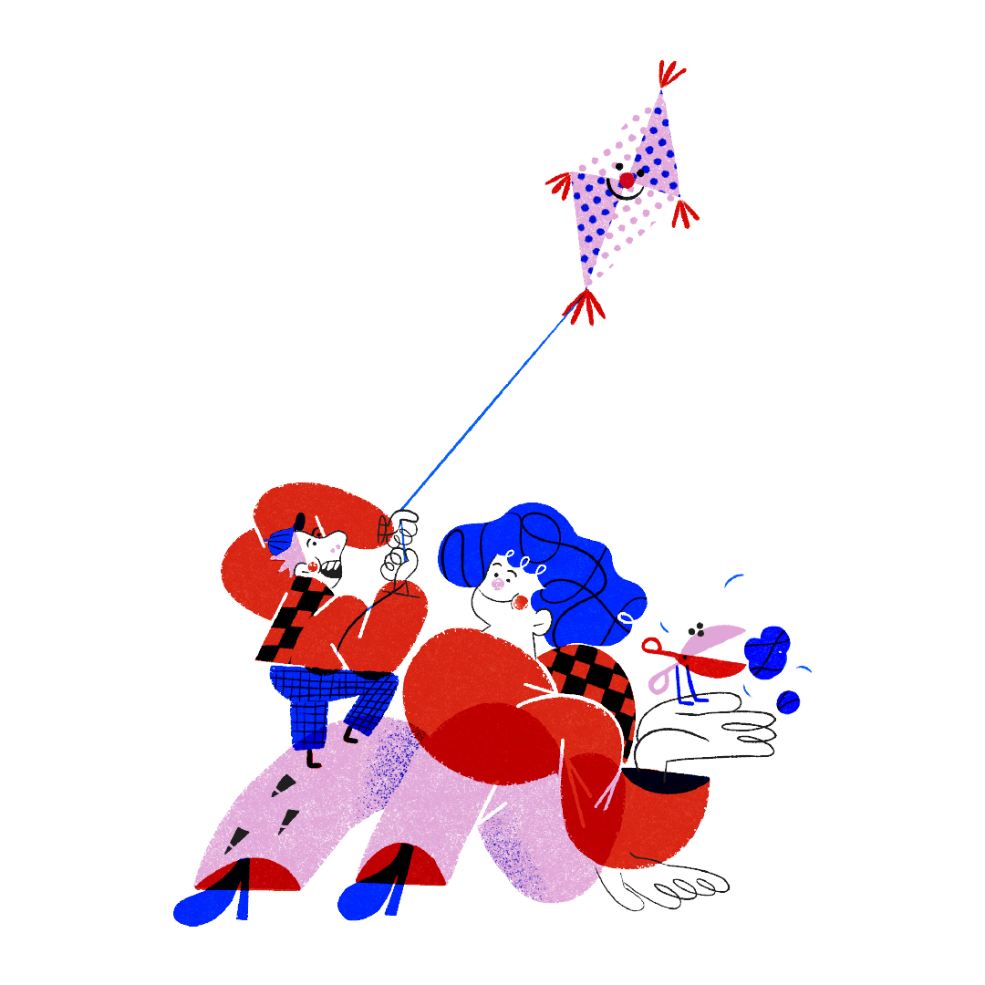 I created characters by cutting out coloured shapes similar to paper cut-out figurines made by children. Children's book moodsare evoked by the risograph technique's use of layered overlays.