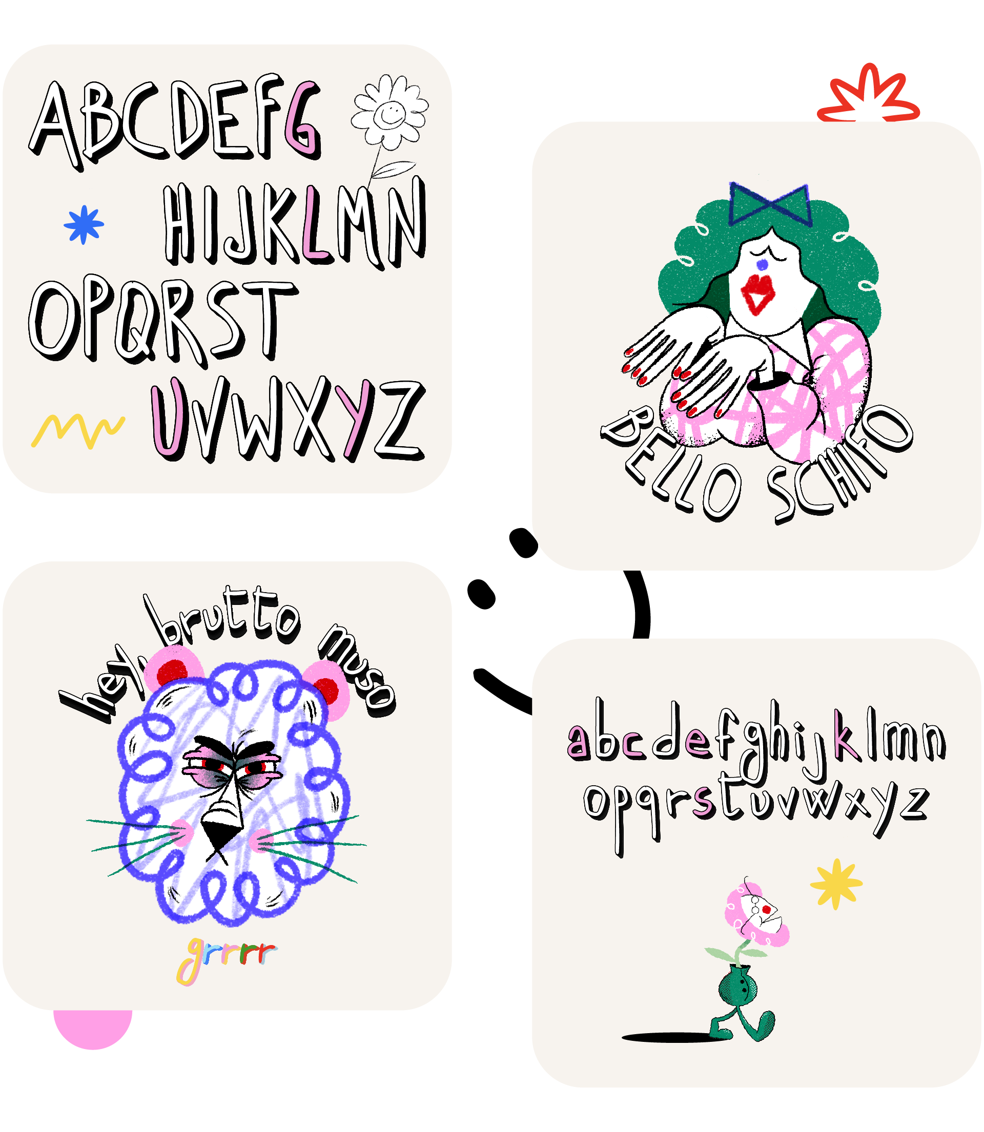 I mixed brutalistic design with a pop-punk look of the 1990s. I made the identity cohesive with childish drawings and the hand-drawn custom typeface.